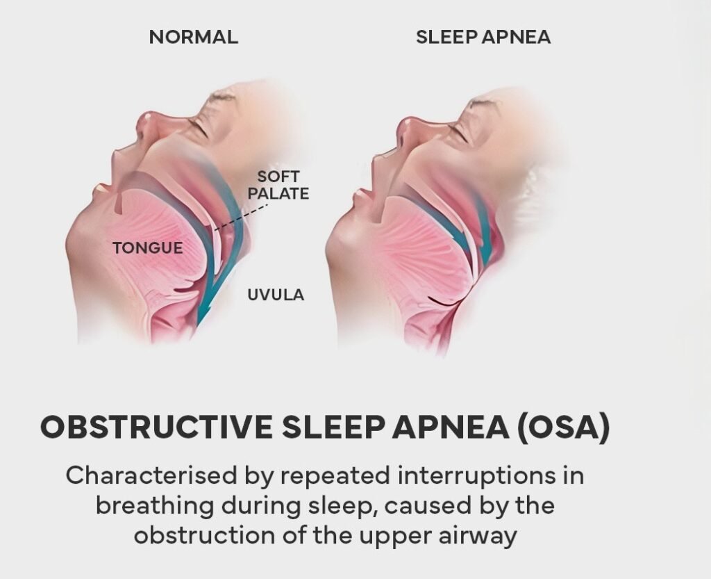 There are two types: obstructive sleep apnea (OSA) and central sleep apnea. Obstructive sleep apnea is the most common form, caused by complete or partial airway blockage during sleep. Men, people who are overweight, and individuals over 40 are at greater risk for developing sleep apnea